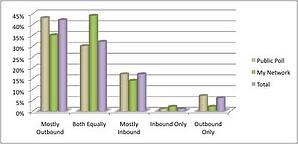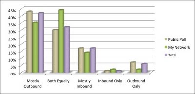 The target audience was Sales & Marketing job functions, from the industries of Computer Hardware & Software, Internet, IT and Tech Services, Marketing & Advertising. We used the LinkedIn Poll Application to conduct the study, as well as the free distribution of the poll to our network. It is not the results of either poll separately that are interesting, we expected the Outbound mix to lead, but the comparison of both the public (random marketing and sales execs) poll to our private network (heavily demand gen focused professionals) shows a clear trend that those of us that focus on demand gen have more of a balanced mix with “Both Equally” leading the pack at 43% in our network.